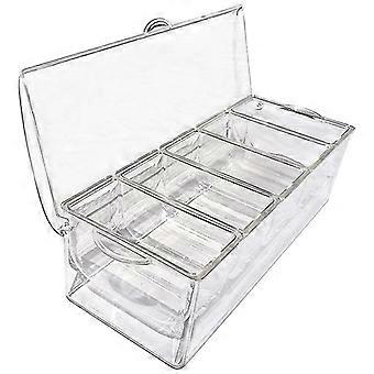 KEEPS FOODS : Layer ice at the bottom of the container to keep food cool and for hours. Perfect for condiments, fruits, salads, dressings/sauces, garnish and much more.GREAT SIZE: Each removable compartment holds 2 cups of food to minimize the need to refill.TONGS AND SPOONS: Three tongs and three small serving spoons are included to match the Ice Chilled Server for .VERSATILE: Use it for many occasions. If you are having an outdoor BBQ, at the beach, picnicking or tailgating you will love the spacious hinged lid that helps keep your food clean. The chic clear acrylic elegantly fits into any decor for your indoor parties.Colour: transparentMaterial: PETPackage Contents:1 * Seasoning boxOnly the above package content, other products are not included.Note: Light and different displays may cause the color of the item in the a little different from the real thing. The measurement allowed error is +/- 1-3cm.